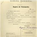 Registo de velocípede de marca Saltley, com o nº 169, em nome de Eugénia Morais Saraiva, moradora em Pero Pinheiro.